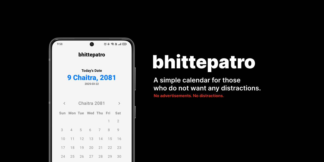 A simple calendar for those who do not want any distractions. Source code available at https://github.com/sudanchapagain/bhittepatro